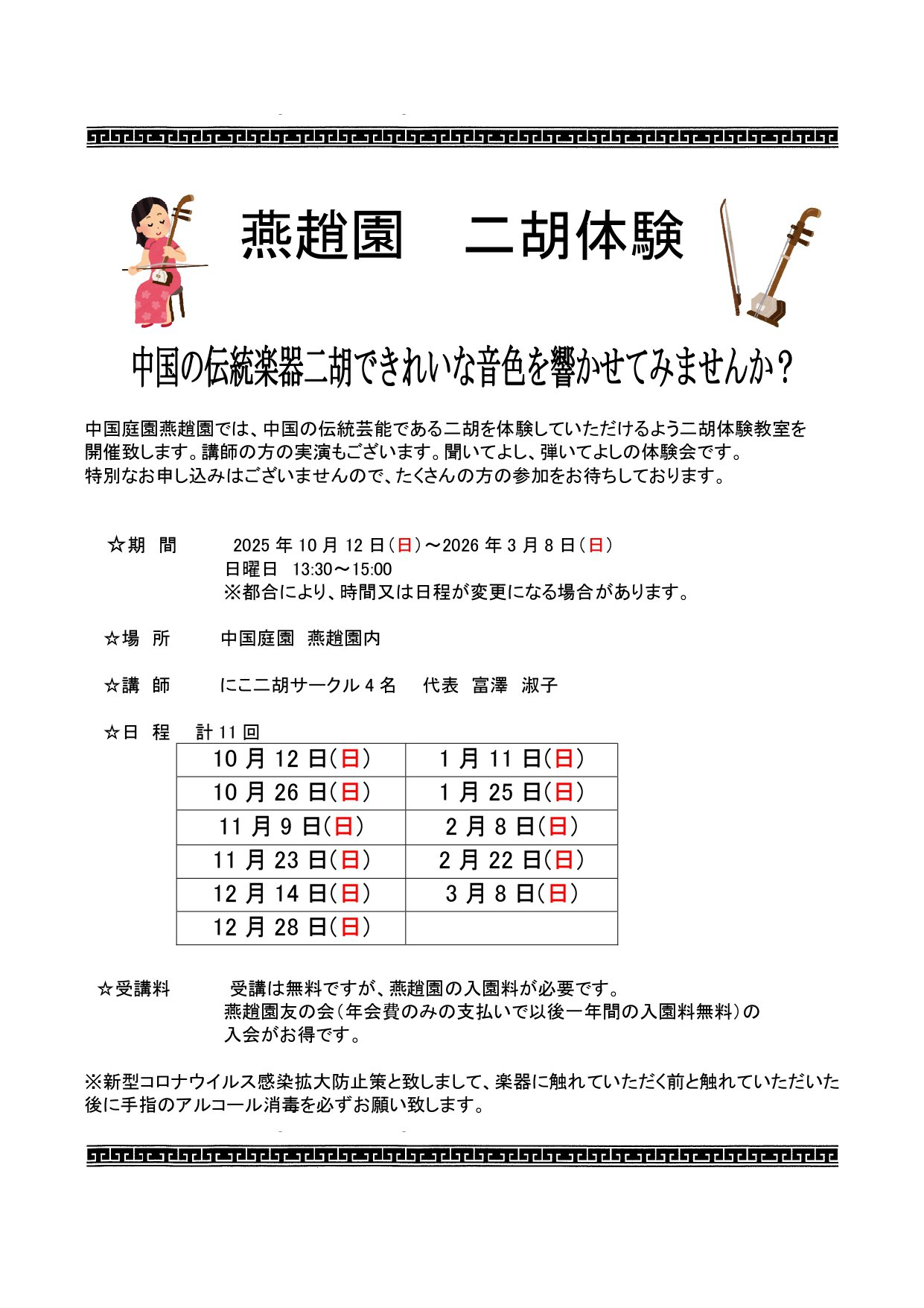 燕趙園では毎月中国語講座(要事前予約)、二胡教室(当日参加可)、ふれあい太極拳(当日参加可、動きやすい服装でご参加ください)の3種類の講座を開催しております。